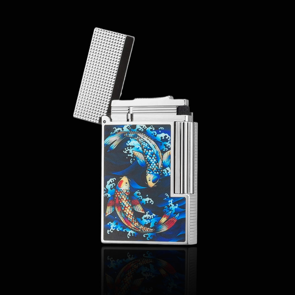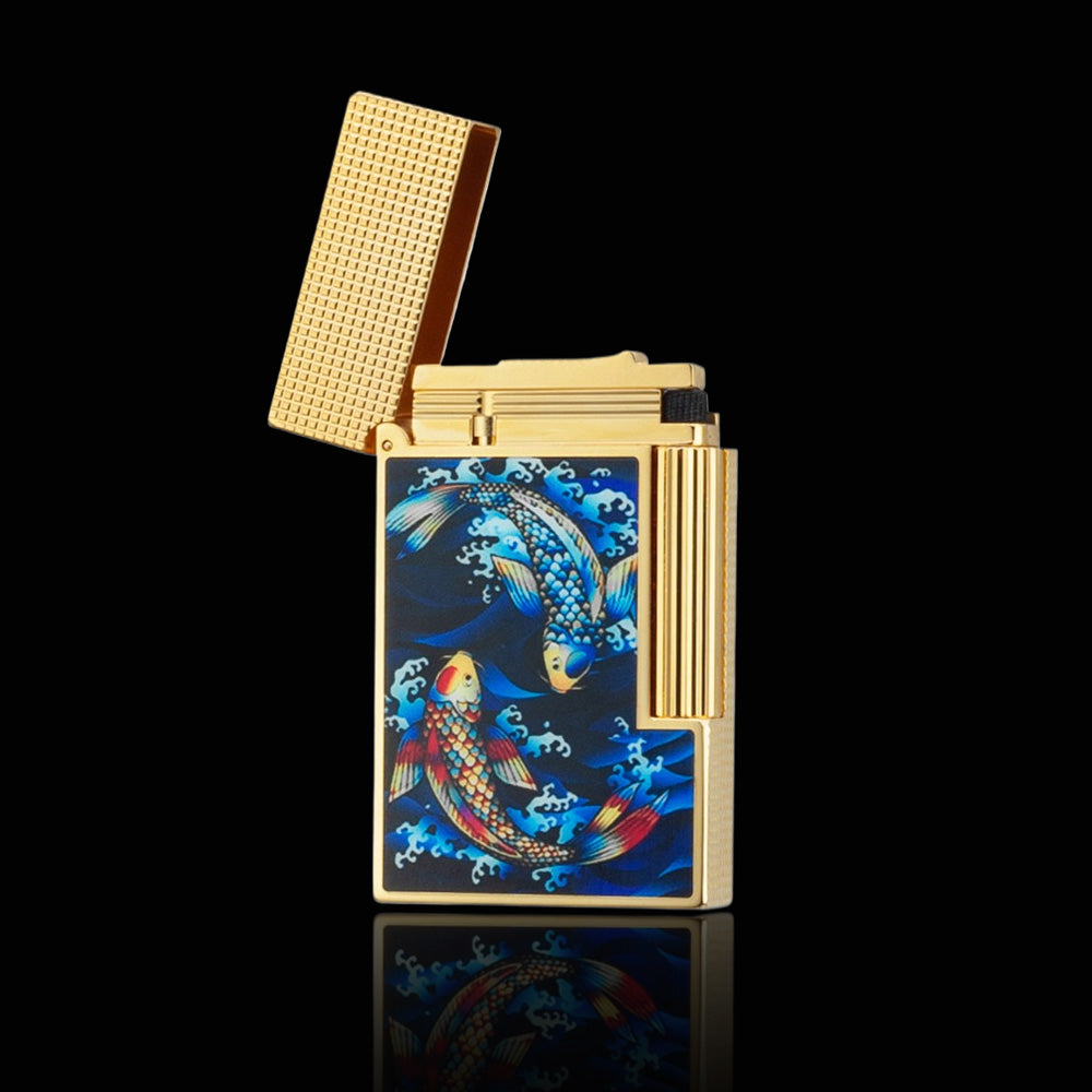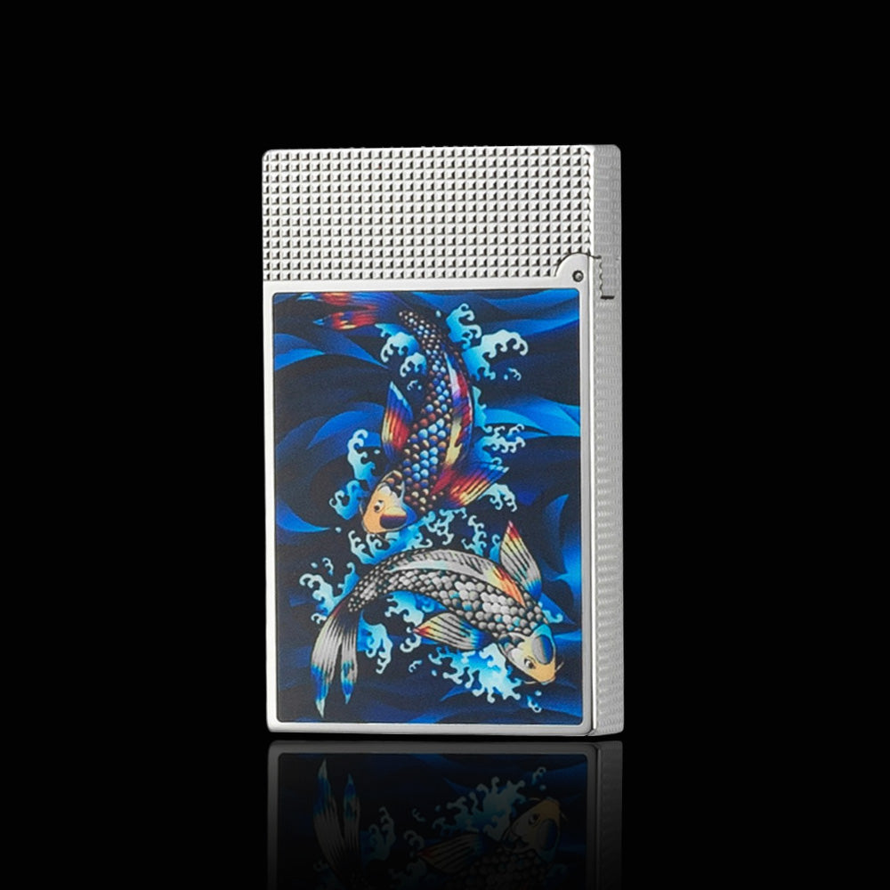 Celebrate the spirit of strength and resilience with the JT Dunant Koi Ligne 2 lighter. Inspired by traditional Japanese woodblock prints, it features elegant engravings of koi fish, symbolizing courage and perseverance. Crafted from solid metal with refined gold and silver finishes, it combines artistry with functionality in a timeless design. |